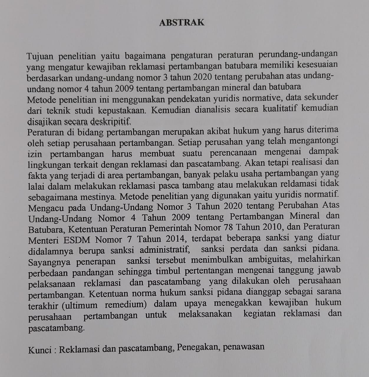 IMPLEMENTASI PENGATURAN REKLAMASI PASCA TAMBANG BATUBARA DI KALIMANTAN TIMUR BERDASARKAN UNDANG-UNDANG NOMOR 3 TAHUN 2020 TENTANG PERUBAHAN ATAS UNDANG-UNDANG NOMOR 4 TAHUN 2009 TENTANG PERTAMBANGAN MINERAL DAN BATUBARA