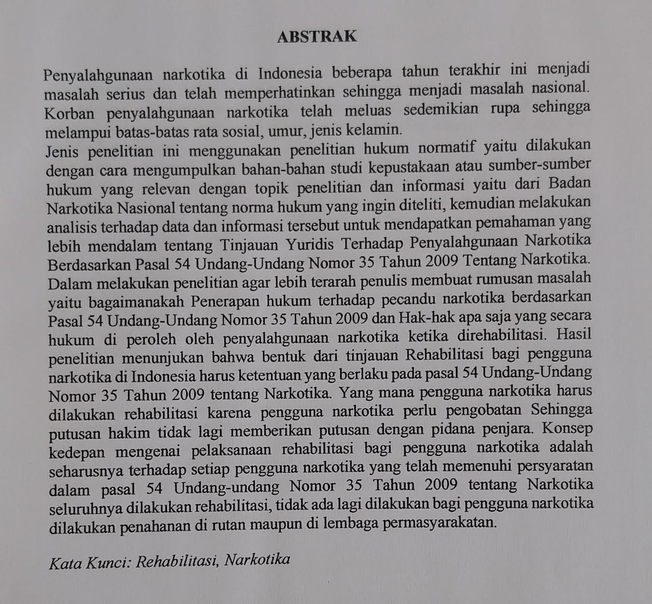 TINJAUAN YURIDIS TERHADAP PENYALAHGUNAAN NARKOTIKA BERDASARKAN PASAL 54 UNDANG-UNDANG NOMOR 35 TAHUN 2009 TENTANG NARKOTIKA