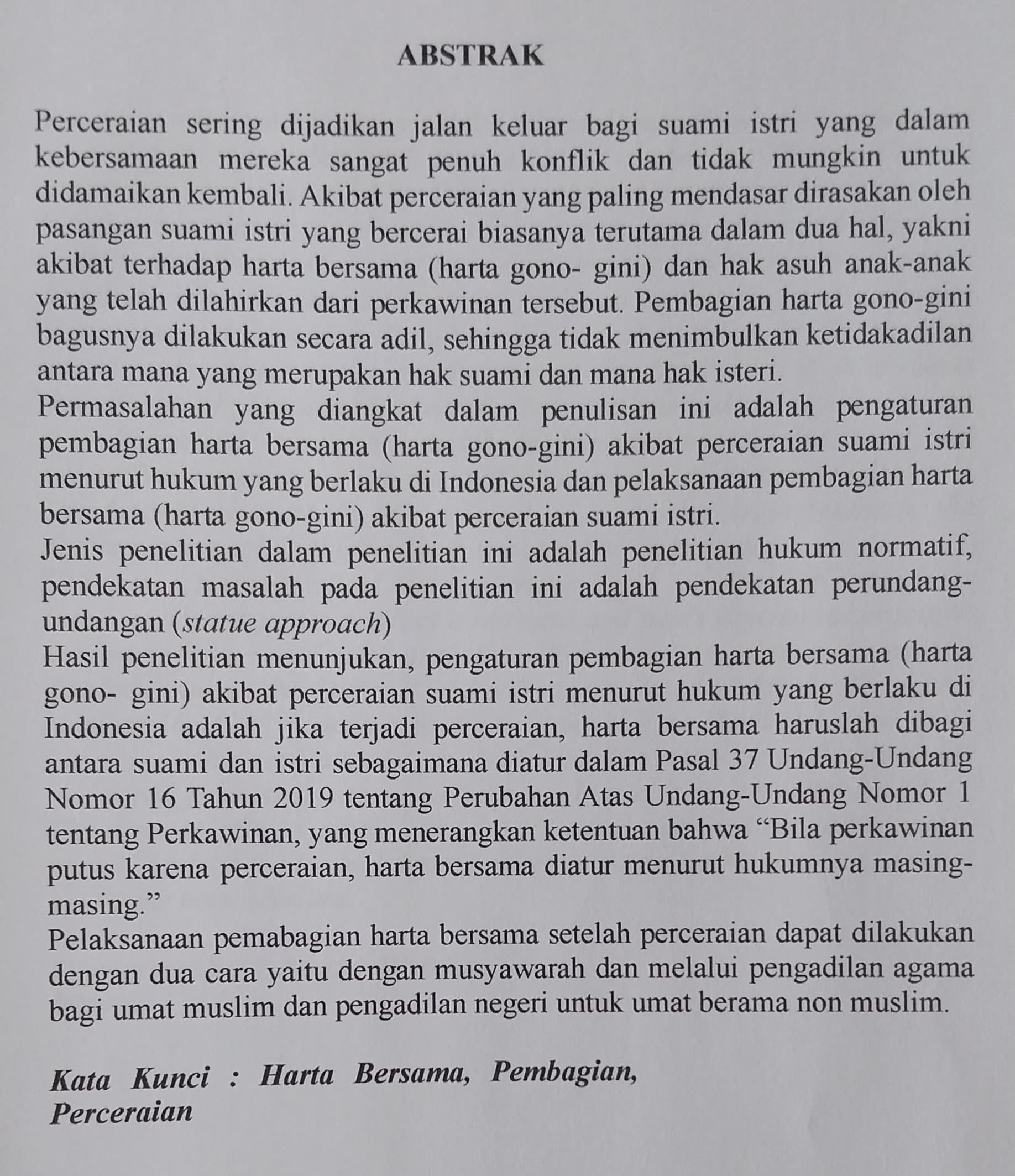 PEMBAGIAN HARTA BERSAMA SUAMI ISTRI SETELAH MELAKUKAN PERCERAIAN