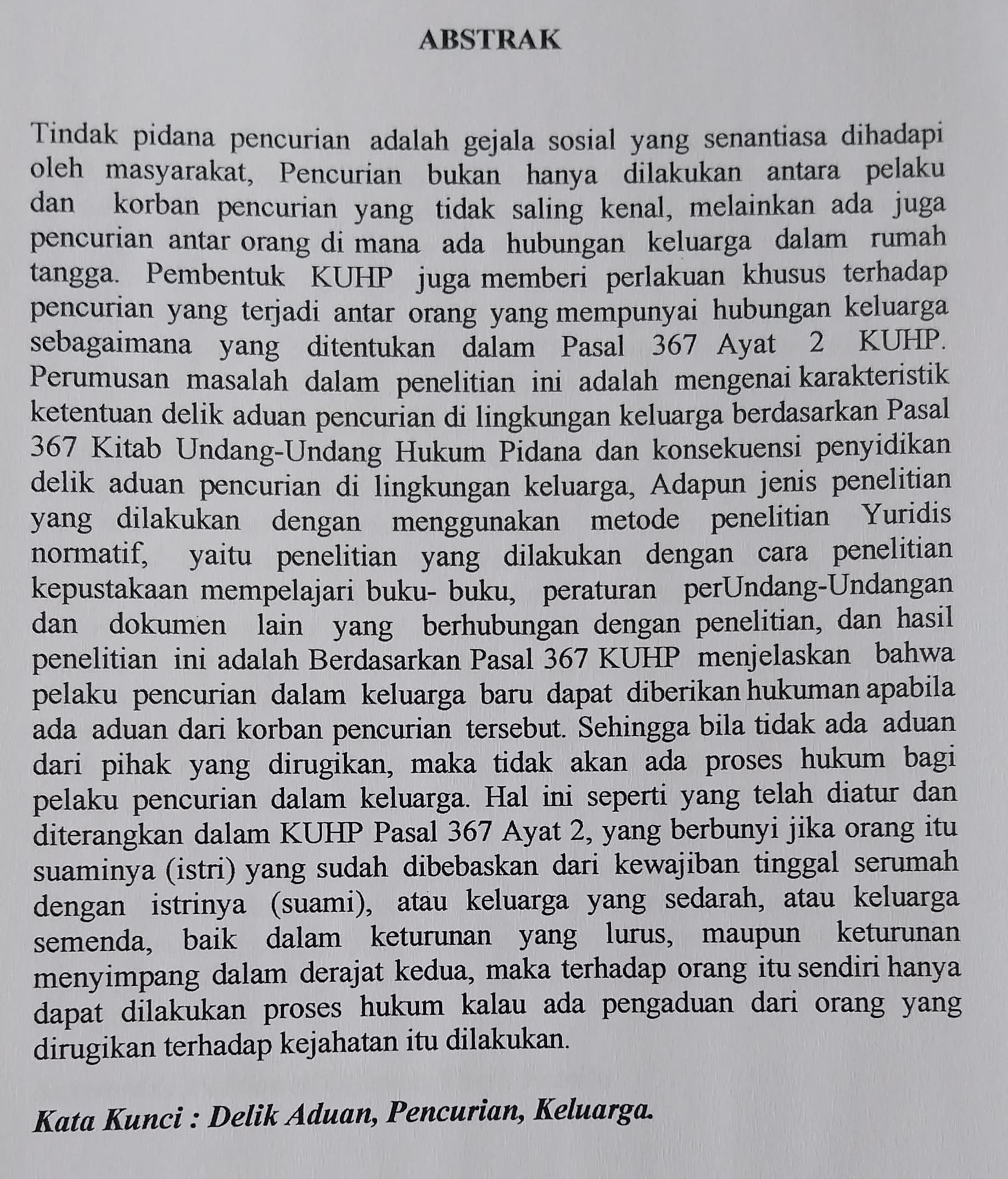 TINJAUAN YURIDIS DELIK ADUAN TERHADAP PELAKU PENCURIAN DALAM KELUARGA BERRDASARKAN PASAL 367 KITAB UNDANG-UNDANG HUKUM PIDANA