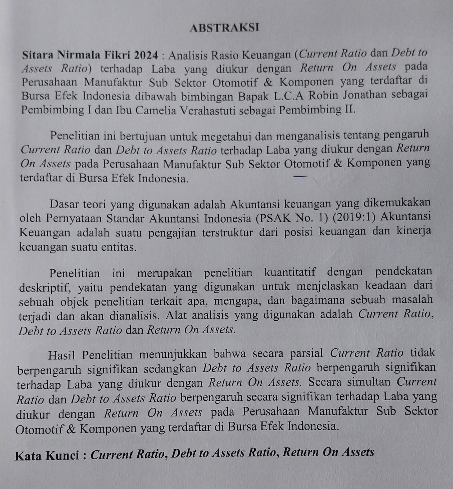 ANALISIS RASIO KEUANGAN (CURRENT RATIO DAN DEBT TO ASSETS RATIO) TERHADAP LABA YANG DI UKUR DENGAN RETURN ON ASSETS PADA PERUSAHAAN MANUFAKTUR SUB SEKTOR OTOMOTIF & KOMPONEN YANG TERDAFTAR DI BURSA EFEK INDONESIA