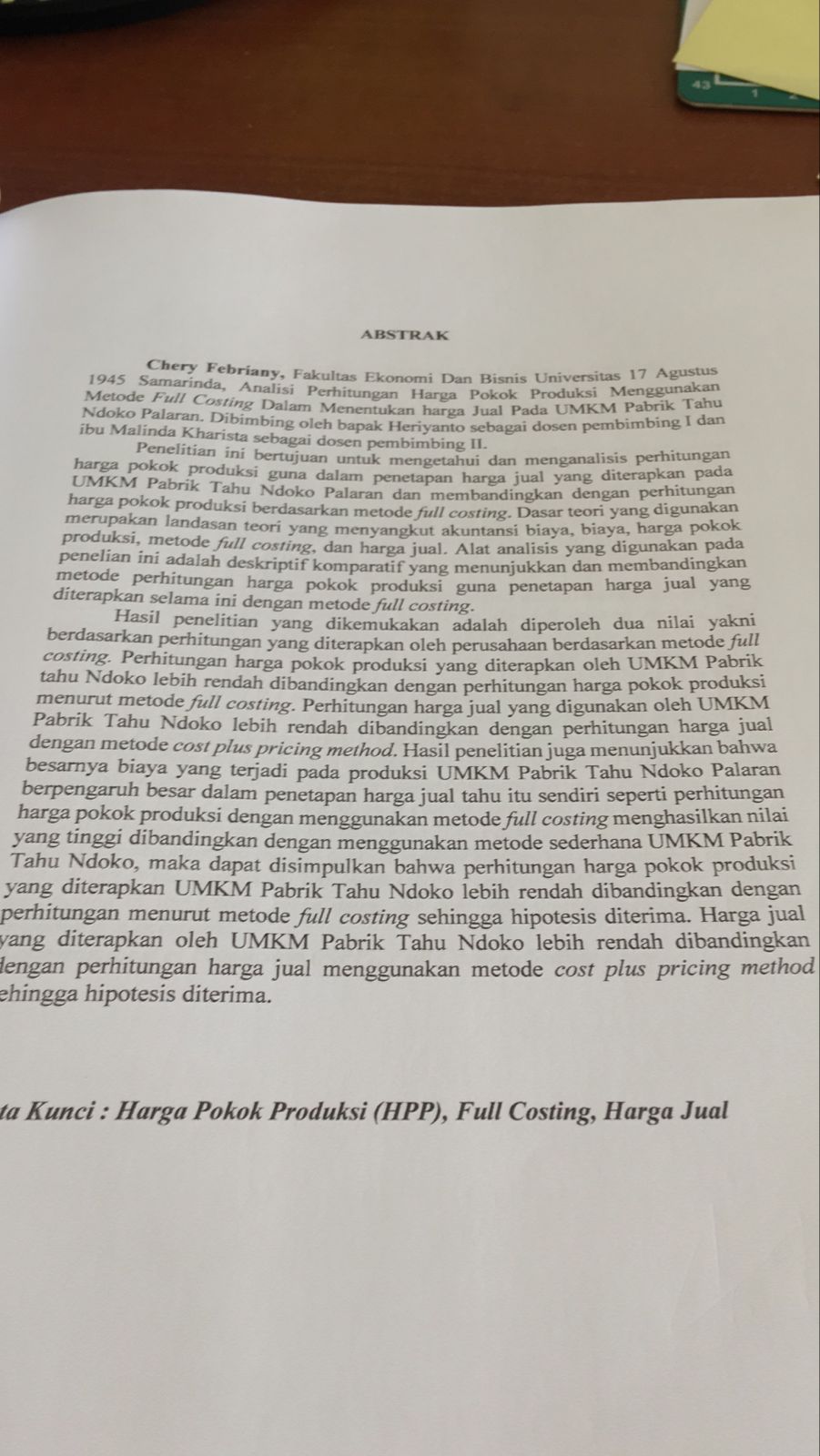 ANALISIS PERHITUNGAN HARGA POKOK PRODUKSI MENGGUNAKAN METODE FULL COSTING DALAM MENENTUKAN HARGA JUAL PADA UMKM PABRIK TAHU NDOKO PALARAN