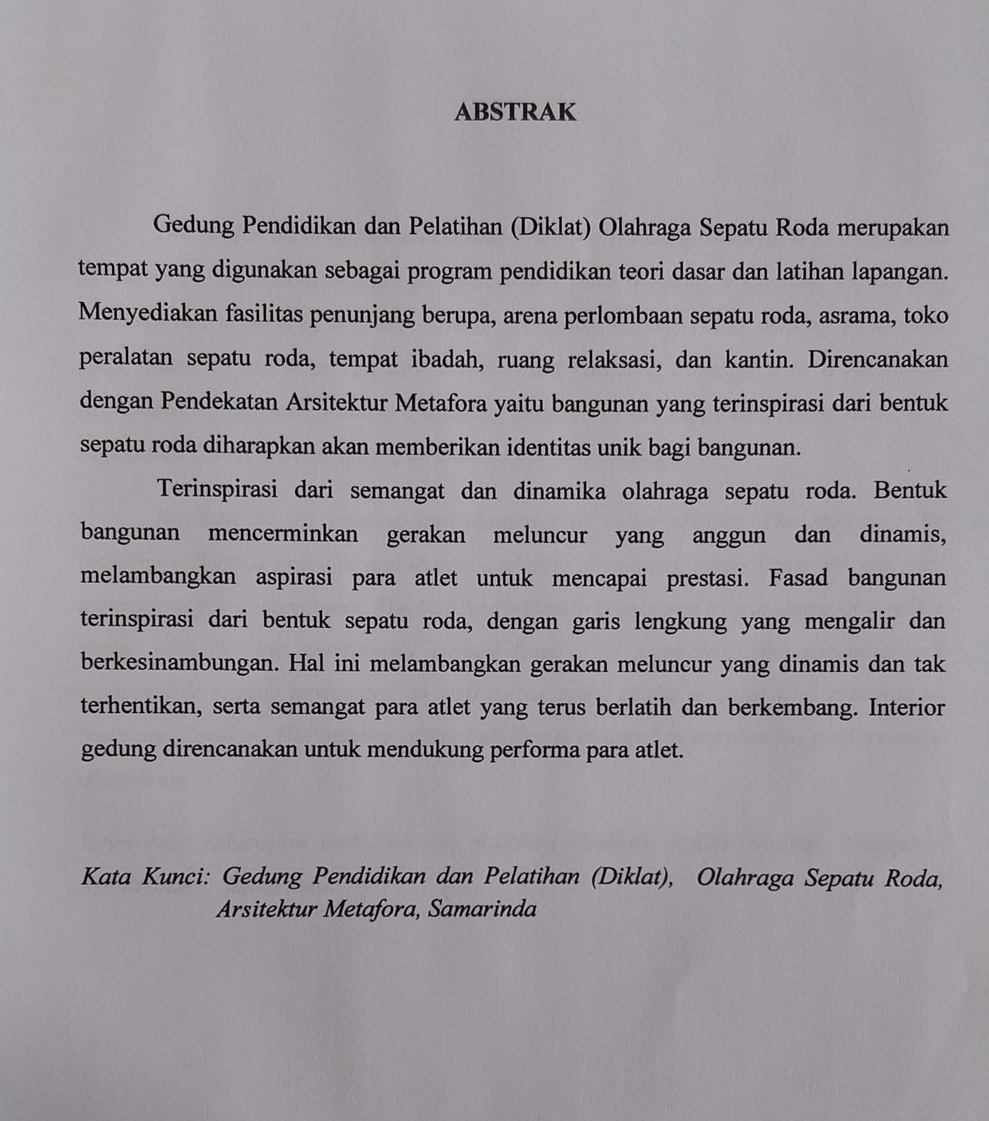 PERENCANAAN GEDUNG PENDIDIKAN DAN PELATIHAN (DIKLAT) OLAHRAGA SEPATU RODA DI SAMARINDA DENGAN PENDEKATAN ARSITEKTUR METAFORA