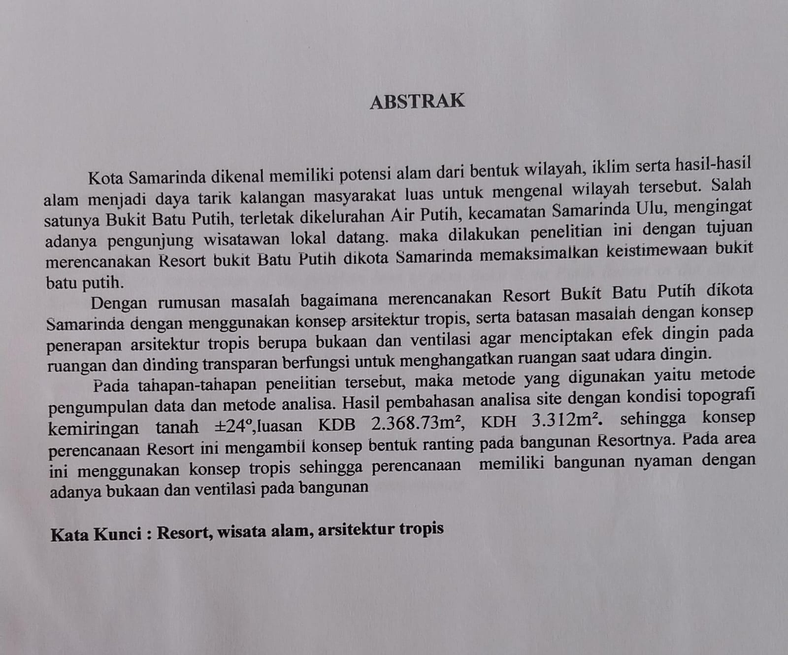 PERANCANGAN RESORT BUKIT BATU PUTIH DI KOTA SAMARINDA DENGAN PENEKANAN ARSITEKTUR TROPIS