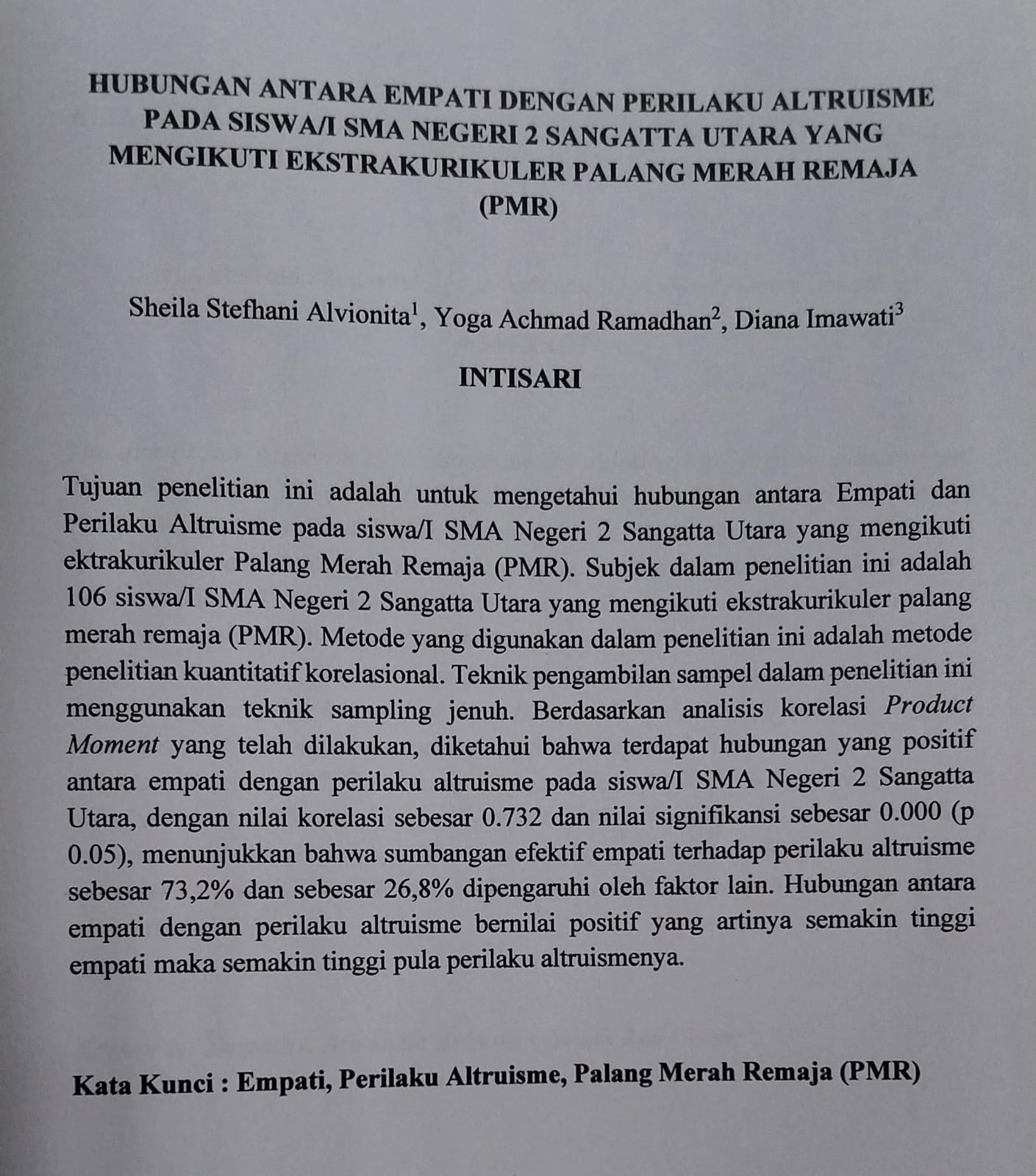 HUBUNGAN ANTARA EMPATI DENGAN PERILAKU ALTRUISME PADA SISWA/I SMA NEGERI 2 SANGATTA UTARA YANG MENGIKUTI EKSTRAKURIKULER PALANG MERAH REMAJA (PMR)
