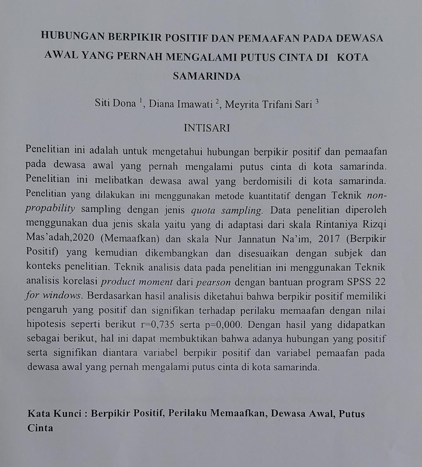 HUBUNGAN BERPIKIR POSITIF DAN PEMAAFAN PADA DEWASA AWAL YANG PERNAH MENGALAMI PUTUS CINTA DI KOTA SAMARINDA