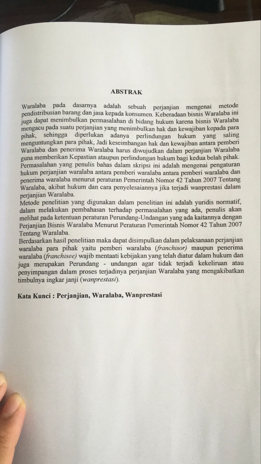 TINJAUAN YURIDIS AKIBAT HUKUM TERJADINYA WANPRESTASI DALAM PROSES PERJANJIAN WARALABA (FRANCHISE) BERDASARKAN PERATURAN PEMERINTAH NOMOR 42 TAHUN 2007 TENTNAG WARALABA