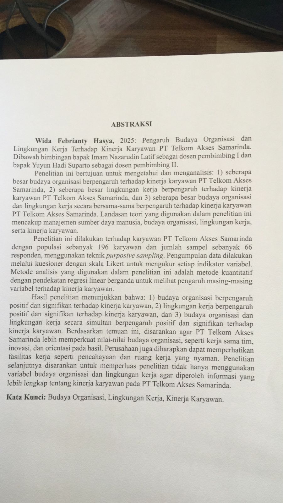 PENGARUH BUDAYA ORGANISASI DAN LINGKUNGAN KERJA TERHADAP KINERJA KARYAWAN PT TELKOM AKSES SAMARINDA