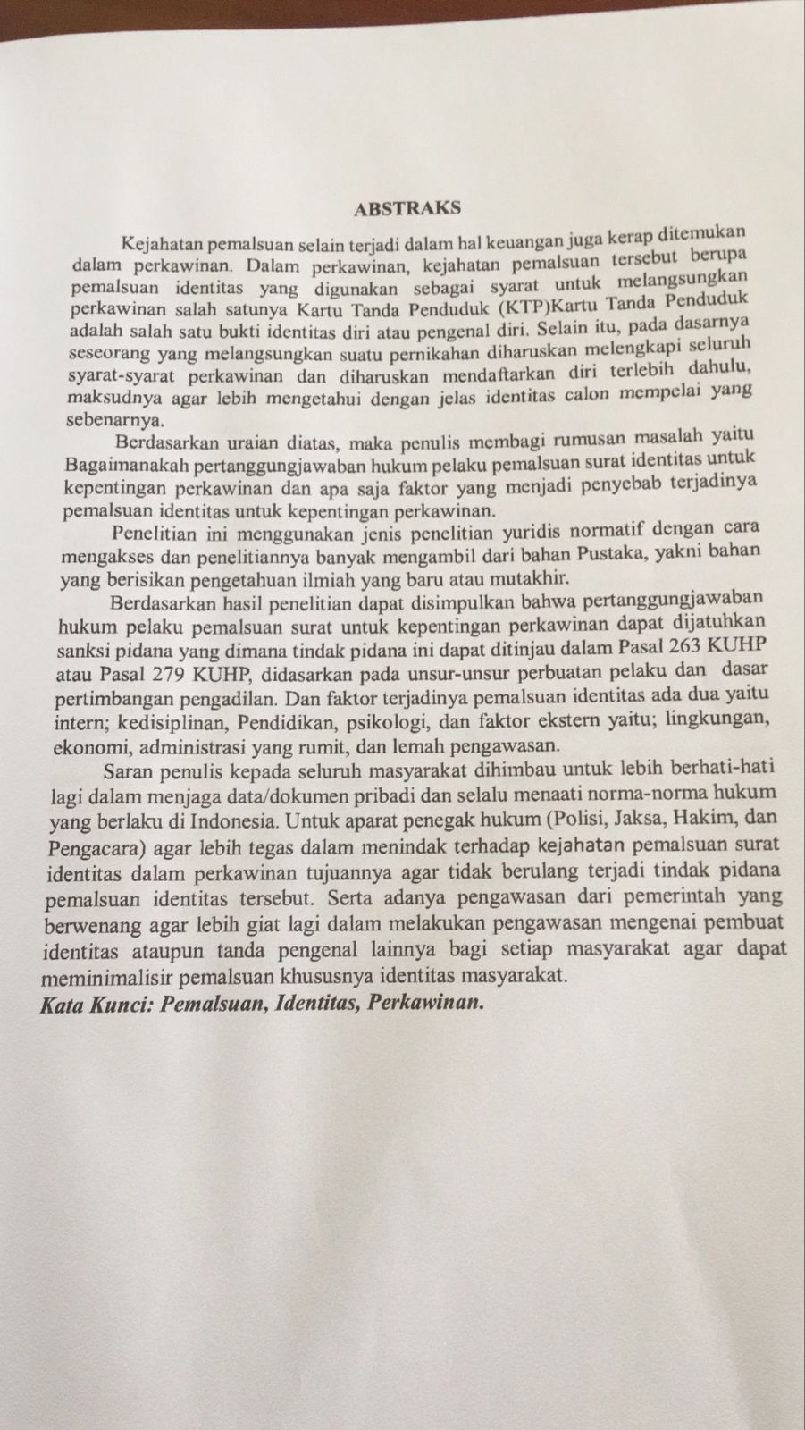TINJAUAN HUKUM PEMALSUAN UANG IDENTITAS UNTUK KEPENTINGAN PERKAWINAN