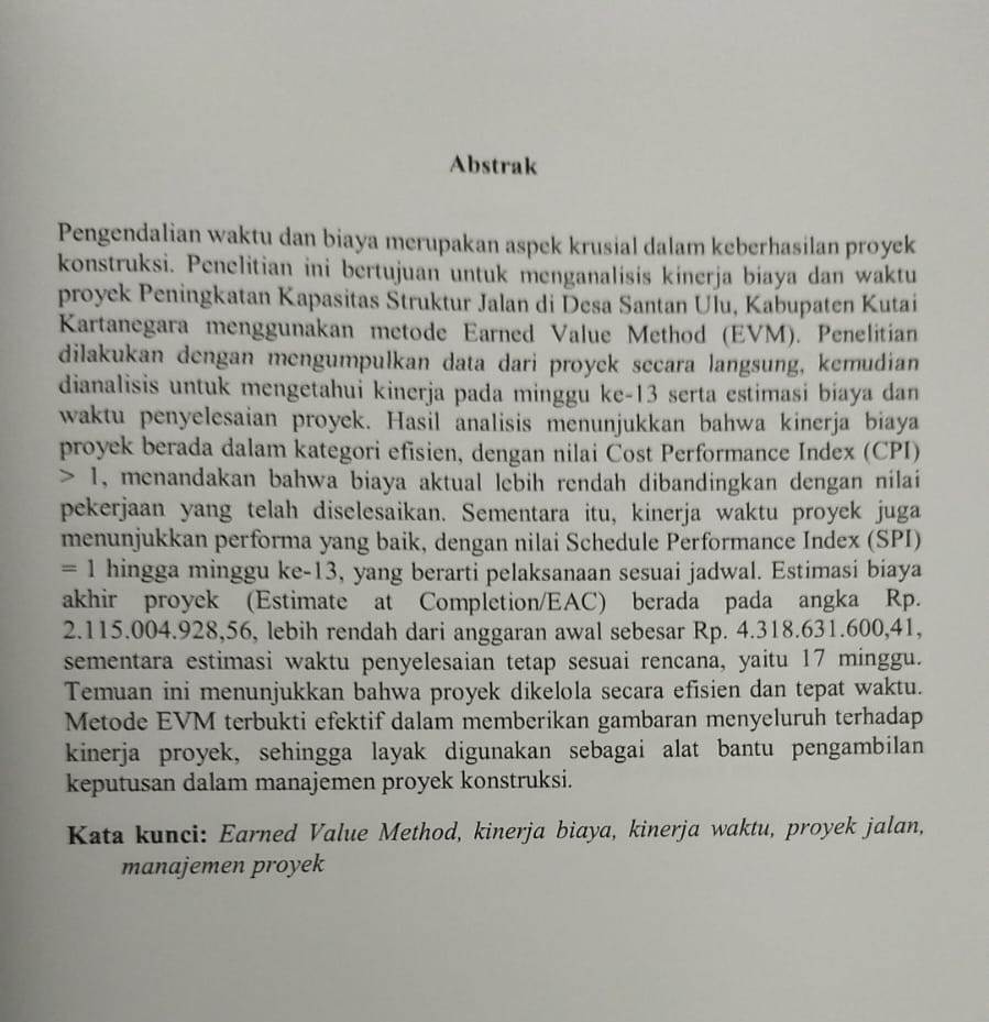ANALISIS KINERJA WAKTU DAN BIAYA DENGAN METODE NILAI HASIL (EARNED VALUE METHOD) STUDY KASUS : PENINGKATAN STRUKTUR JALAN DESA SANTAN ULU KABUPATEN KUTAI KARTANEGARA