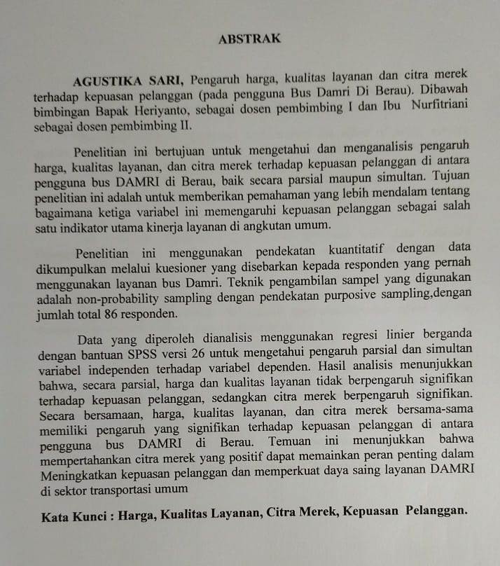 PENGARUH HARGA, KUALITAS LAYANAN DAN CITRA MEREK TERHADAP KEPUASAN PELANGGAN (PADA PENGGUNA BUS DAMRI DI BERAU)